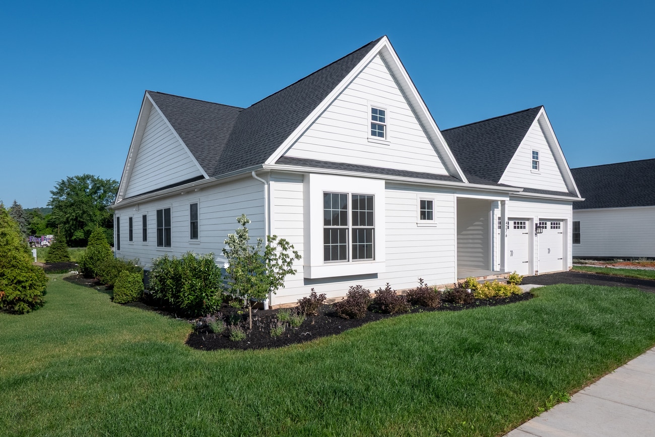 Experience first floor living with The Laurel, a thoughtfully designed three-bedroom, two-bathroom home that effortlessly balances open-concept living with spaces for peaceful retreat. From the moment you enter the welcoming foyer, you’re greeted by a dining room that adapts seamlessly to your lifestyle—ideal for hosting formal dinners or enjoying casual meals. To the right, the private guest quarters offer two spacious bedrooms and a full bath, ensuring comfort and privacy for visitors. As you move through the central hall, the home unveils its breathtaking main living area. The gourmet kitchen, complete with a striking center island, flows into a sunlit breakfast nook and a grand great room. Large windows bathe the space in natural light, while French doors lead to a charming bluestone covered porch and patio —perfect for al fresco dining or quiet evenings under the stars. A gas fireplace adds warmth and sophistication to the great room. Tucked away for ultimate privacy, the owner’s suite is a serene sanctuary. It features a generous walk-in closet and an en-suite bathroom designed for indulgence, complete with a spa-inspired tiled shower, private water closet, and dual vanities. Plenty of parking and storage with a two car garage and a full basement. Elegant, functional, and ready for you to call home, The Laurel offers unparalleled comfort in every detail.